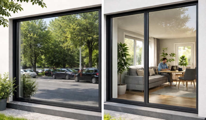 Folie lustrzane montuje się zarówno od strony wewnętrznej, jak i zewnętrznej. Efekt prywatności pozostaje taki sam, ponieważ zależy od światła, a nie od strony aplikacji.